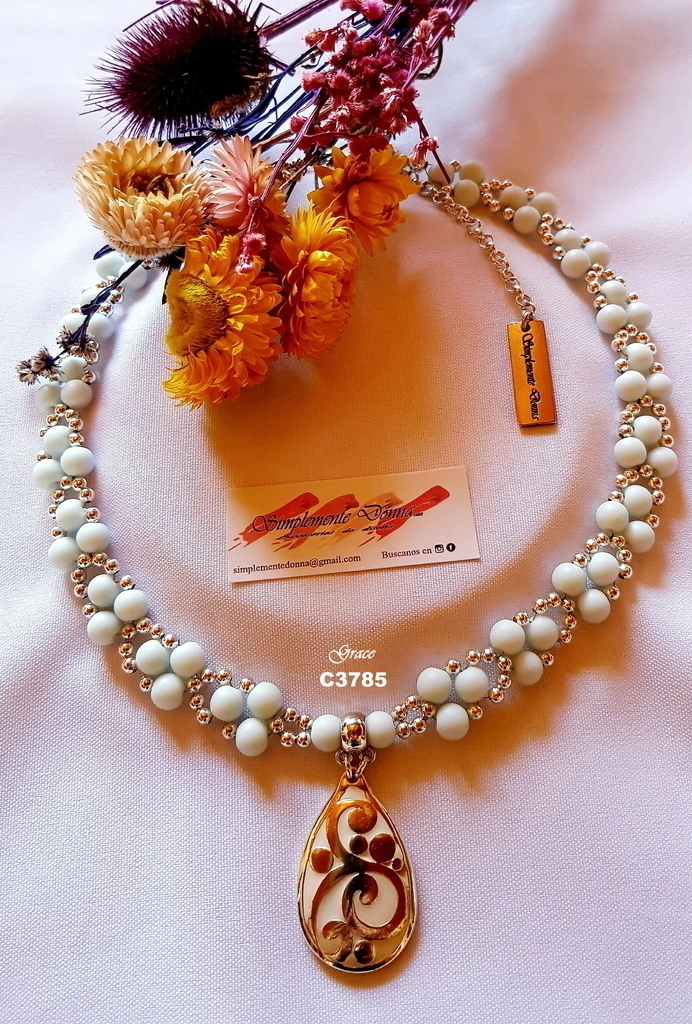 Collar tejido artesanal realizado a mano gota esmaltada baño en plata perlas de vidrio importadas satinadas opacas cuentas de metal.
